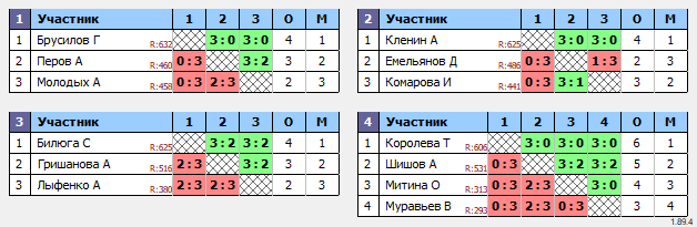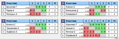 Три из четырёх игроков команды экономического факультета – теннисисты ЦС МГУ. Не удивительно, что именно экономисты вышли в основную финальную сетку первым номером. Их победный порыв поддержали химики – они вышли вторыми. Команды биологического факультета и ФФФХИ продолжат борьбу в утешительном финале. ЭФ –Химфак 5:0 ЭФ – Биофак 5:0 ЭФ – ФФФХИ 5:0 Химфак – Биофак 5:2 Химфак – ФФФХИ 5:2 ФФФХИ –Биофак 5:4