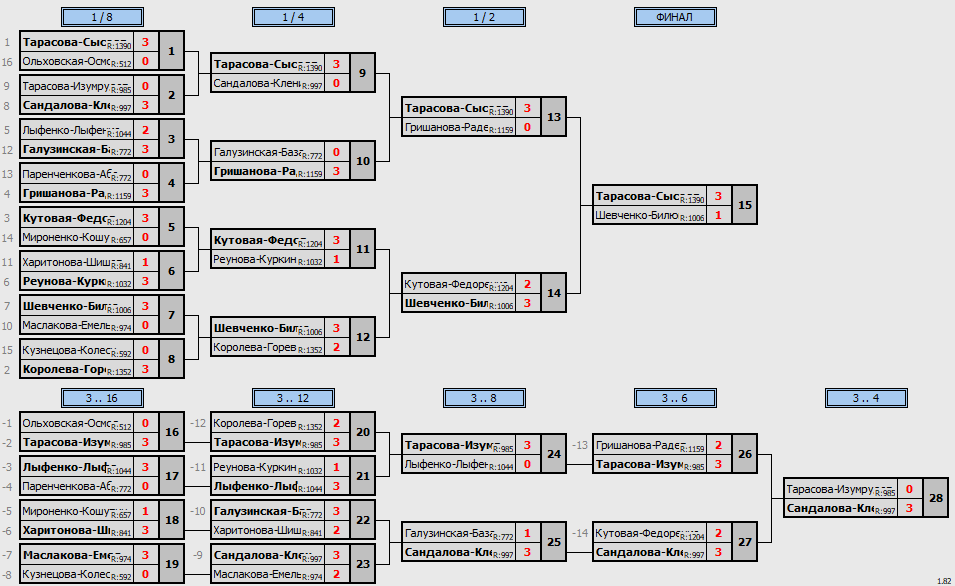 1 и 2 места разыграли самые «крутые» команды. Правда, суммарный рейтинг подсказывал, что первая пара посева – Мария Тарасова (юрфак)/Александр Сысоев (физфак) имеет некоторое преимущество и по тренированности, и по опыту. Не случайно же лидеры прошли к финалу ножом сквозь масло. Второй паре финалистов – Полина Шевченко (ФФМ)/Станислав Билюга (ФГП) путь к финалу давался трудом и упорством. В финальной встрече она выглядела достойно: ребята бились азартно, максимально включая интеллект и самоотдачу. Уступив 1:3, Полина и Станислав стали обладателями «серебра с золотым отливом»!