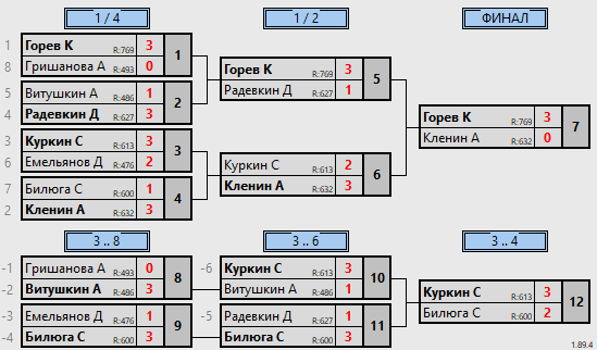 Турнир накануне 8 марта по определению должен быть необычным. Он таковым и состоялся. В финале ключевого игрока сборной МГУ Кирилла Горева экзаменовал главный админ сборной ветеран университетского спорта и довольно редкий гость турнира Станислав Билюга. Студент экзамен сдал без проблем – 3:0. А вот Билюга карабкался к финалу «с песнями и вскриками», сквозь толпу таких же «недовольных собой». А это – и вечно снимающийся физик Александр Сысоев, и гроза авторитетов Полина Шевченко (кстати, плюс 15 к рейтингу), и «Доктор Айболит» Александра Молодых… «Бронза» заслуженно досталась надежно-скромному географу, берегущему свой глобус Дмитрию Емельянову.